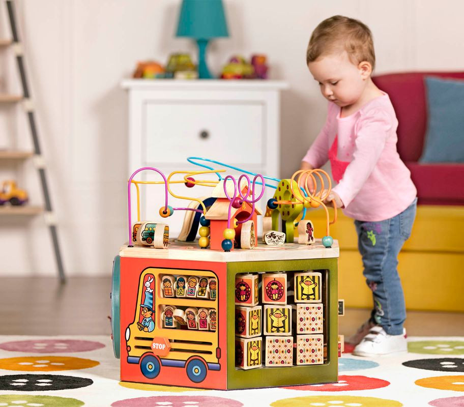 ¡Juega todo el día con el cubo de actividades Youniversity de B. toys! Lo que hace único a este cubo es que permite a tu pequeño aprender incluso mientras juega. ¡Este centro de actividades de madera tiene 6 lados con diversión educativa sin fin! Incluye caminos en zigzag, divertidos bucles, un alfabeto de animales, un árbol de números y diferentes formas, todo ello para poner en marcha el proceso de aprendizaje de tu hijo. La estructura de madera maciza también tiene esquinas redondeadas y un acabado agradable y suave para que tu hijo pueda explorar y descubrir este cubo de actividades de forma segura. Recomendado para niños a partir de 1 año.